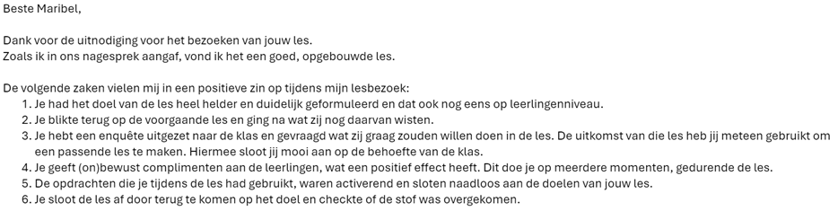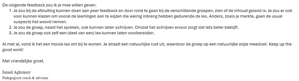Tot slot lukte het mij om een uitstekende docent en pedagogisch coach uit te nodigen om één van de lessen te observeren. Hierbij zijn feedback: