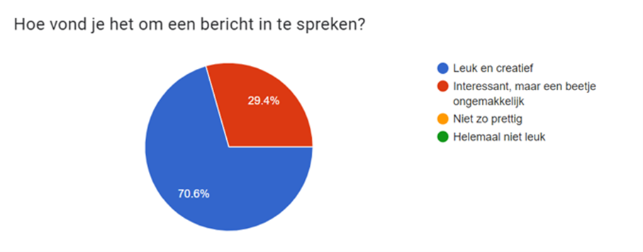 Elf van de vijftien leerlingen van de klas voor wie ik deze lessenserie had gemaakt, hebben uiteindelijk de gevorderde versie van de spraakmemo gemaakt. Iedereen heeft het einddoel gehaald. Ik was er getuige van hoe zij gemotiveerd aan de slag gingen. Regelmatig kwamen ze naar mij toe, ook buiten de les, om bijvoorbeeld de uitspraak te laten controleren. Ze hielpen elkaar met de opnamen van hun voiceberichten en toonden een serieuze werkhouding. Na afloop hebben ze het project als volgt geëvalueerd:
